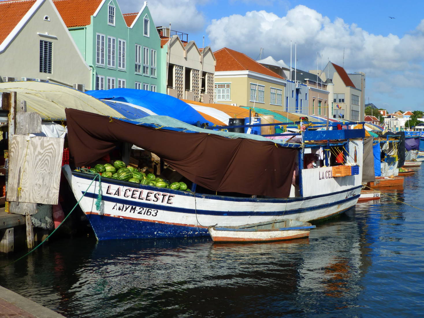 В самую Венесуэлу, даже после смерти Гуго Шавеза, нас особенно не тянет, а на Антильские острова, входящие в королевство Голландии,- вполне. Острова - вулканического происхождения (Аруба, Кюрасао, Бонэйр), почвы на них почти нет, поэтому овощи-фрукты привозят за 100 км с континента - из Венесуэлы. Вот и здесь на картинке - "плавучий рынок" торгуют с венесуэльских лодок на сушу Кюрасао, в центре столицы, Виллемстада.
