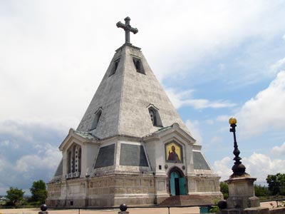 На фото: Храм Святителя Николая Чудотворца на Братском кладбище Севастополя, который был построен на народные пожертвования в честь защитников Города-героя, погибших во время Крымской войны 1854-55 гг. Архитектор А.А. Авдеев. Заложили храм в 1857 г., а освятили в 1870 г. Храм, в форме усеченной пирамиды, венчает массивный крест, выполненный из полированного диорита. На наружных гранях установлены мраморные доски, на которых перечислены полки, принимавшие участие в обороне города, время их прибытия, численный состав и количество погибших в боях. Изнутри на стенах укреплены 38 плит с именами 943 погибших офицеров.
