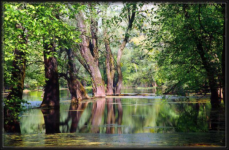Разлилась на поля и луга.