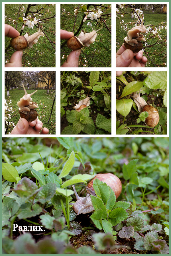 - Вот ты где! Радость переполняла мою душу. Равлик спрятался от солнца под большой лист какого-то цветка под молодой вишней. На руки я брать его не стал. Решил сфоткать в процессе перемещения.