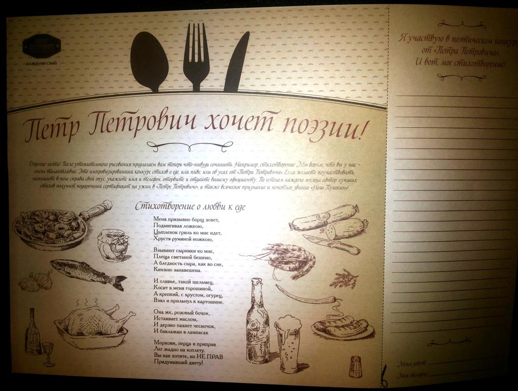 ...в ресторане 'Пётр Петрович' проводится конкурс на лучшее стихотворение