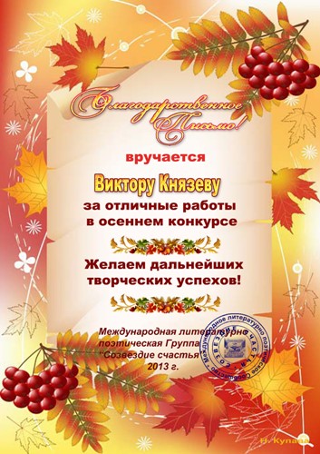 Благодарственное письмо за отличные работы в осеннем конкурсе 2013 год