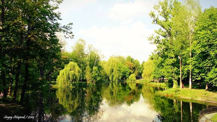 высокие деревья парка на берегу,