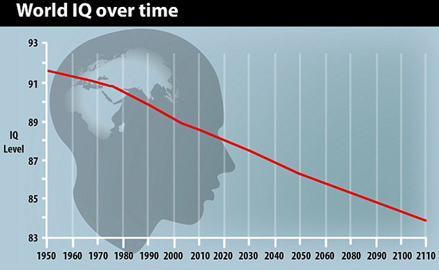 Ричард определил усредненные значения - эдакие мировые уровни интеллекта по годам. И обнаружил, что к 2014 году IQ упал почти на 3 пункта с уровня 1950 года. И если поглупение продолжится нынешними темпами, то к 2110 году IQ человечества опустится ниже 84 пунктов. А это будет означать, что оно станет умственно посредственным.