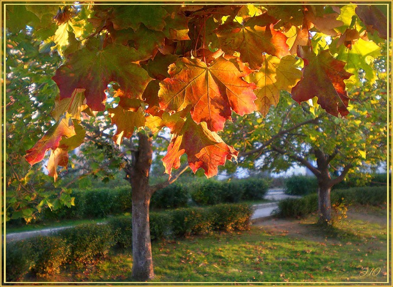 На зелёный ковёр, тихо, в "золоте" падают листья