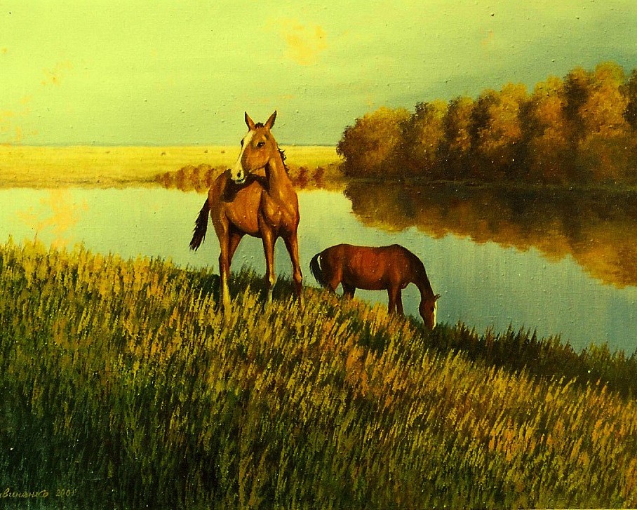 Кони бредут к водопою,