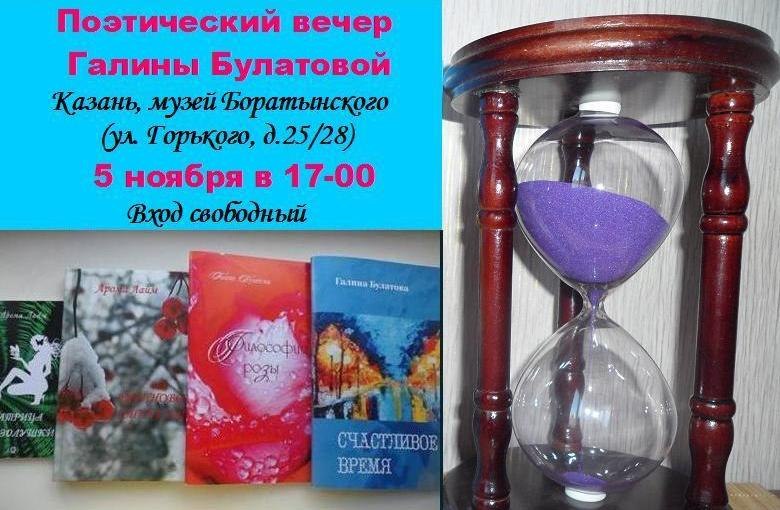 5 ноября в 17 часов в казанском музее Е.Боратынского состоится вечер поэзии Галины Булатовой, лауреата фестиваля "Галактика любви" им.В.Тушновой, автора нескольких поэтических сборников. Вход свободный.