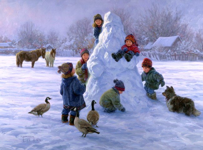 Дети лепят снежных баб, им хорошо!