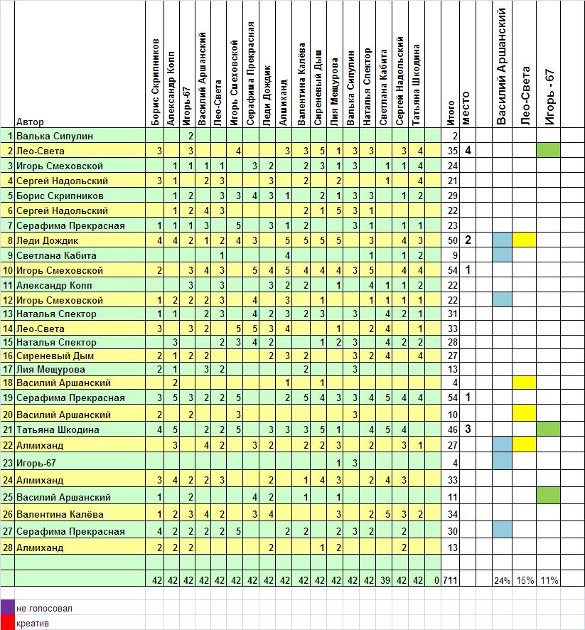 Приятно отметить, что в этот раз у нас нет авторов, пренебрёгших голосование, и штрафовать никого не пришлось)).