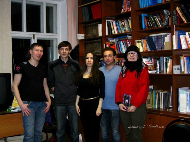 Авторы ЛИТО "Белая ворона": Ильдар Сафин, Рустем Аубакиров, Юлия Сандлер, Александр Кордончик на занятии в библиотеке и я, оно было посвящено видеопоэзии. 18.01.15