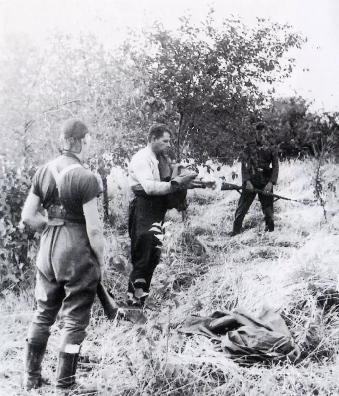 /Фото с сайта http://waralbum.ru/131442/.Командир Красной Армии перед расстрелом. Фото сделано в августе-сентябре 1941 г. в полосе немецкой группы армий «Юг» (Украина). В материалах к фото («Operation Barbarossa» G. Bernage) утверждается, что это «офицер ОГПУ».