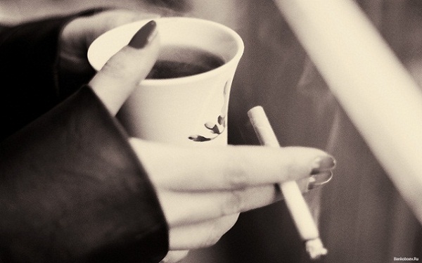 Сигарета в руке, а в другой чашка с кофе,