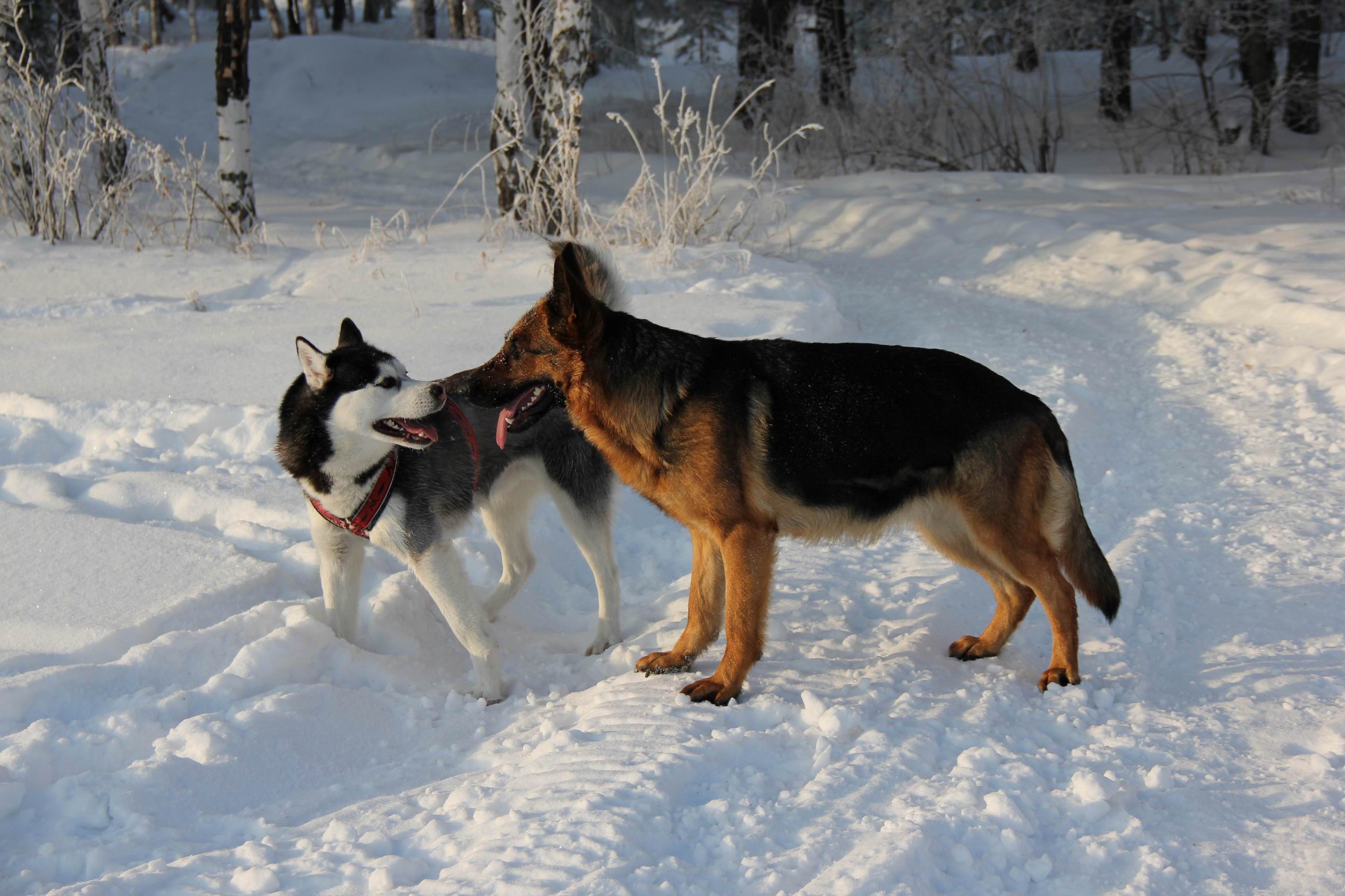 На фото моя Чара с соседским псом Юконом, которого она играючи укладывает на лопатки (он даже перечить ей не в состоянии, лежит в снегу, задрав лапки вверх). Зима 2014 года, п. Усть-Заостровка.