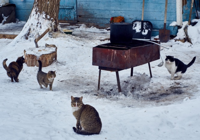 У мангала бродят кошки.
