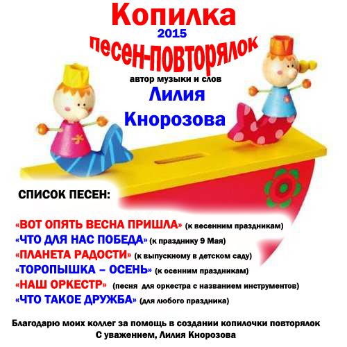 Я здесь:: Форум "Музыкальный Ларец" ШКАТУЛКА С ЭКСКЛЮЗИВАМИ (Композиторы)Лилия Кнорозова. Люблюка и другие Детские песни.