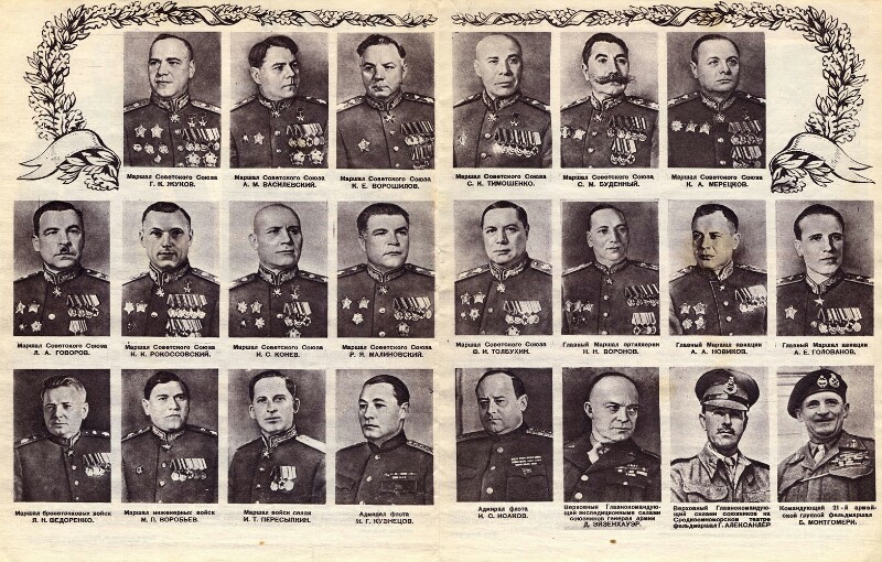 Итак, На Фото Маршалы Советского Союза и главнокомандующие войск Союзников. Это фронтовая Иллюстрация мая 1945 года!