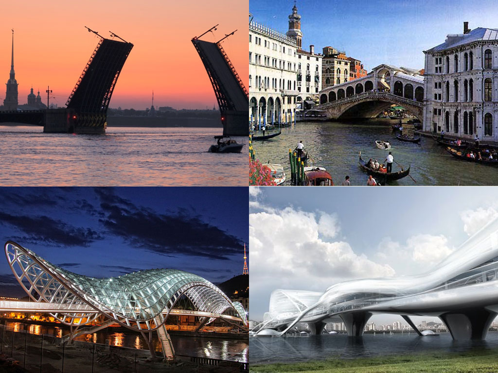 Коллаж автора. Иллюстрации - из интернета. С мостами Санкт-Петербурга, Венеции и с мостами... будущего!