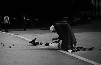 Бабуля крошит хлебец голубям