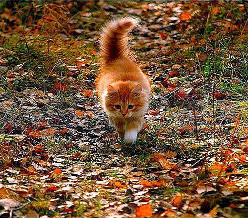Рыжий котёнок по листьям идёт,