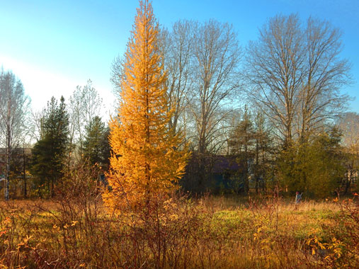 В тусклой безлистности лиственниц яркие пятна…