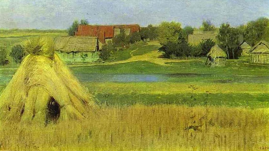 Снопы и деревня за рекою - Левитан