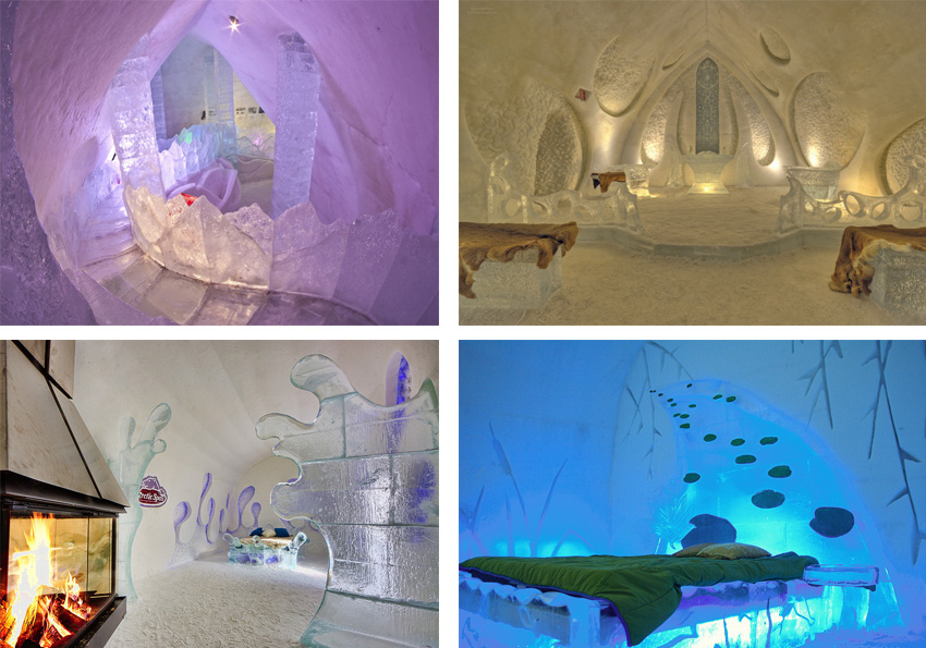 По причинам недолговечности материала, из которого создан Ледяной отель, каждый год его приходится перестраивать. На сооружение отеля площадью около трех тысяч кв.метров, уходит 15 тонн снега и 500 тонн льда. Кажется, что провести здесь ночь будет не очень комфортно, но это не так. На ледяных кроватях лежат теплые матрасы и оленьи шкуры, а спят гости в спальных мешках, разработанных для полярников. Метровая стена льда является естественным теплоизолятором, к тому же, перед сном гостям предложат spa-процедуры и сауну.