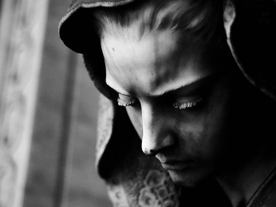 Лицо грустное, мокрое, будто от слёз.