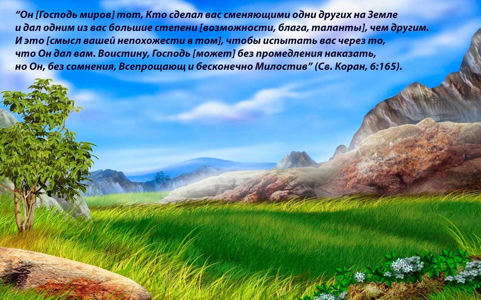 “Он [Господь миров] тот, Кто сделал вас (людей) сменяющими (замещающими) одни других на Земле [сменяют друг друга поколения, руководящие семейные кланы и династии, крупные мировые державы и цивилизации. Земля будто переходит по наследству от одних к другим] и дал одним из вас большие степени [возможности, блага, таланты], чем другим [поднял одних над другими в степенях, в уровне благосостояния, здоровья, интеллектуального развития, красоты, положения в обществе]. И это [смысл вашей непохожести в том], чтобы испытать вас через то, что Он дал вам [через те возможности и блага, которые передаются во временное пользование, завершением чего является смерть. Смерть отдельного человека, смерть последнего представителя царской династии, смерть идеологии и выстроенного на ней государства, смерть очередной цивилизации... На место ушедшего приходит новое для прохождения своего пути, своего экзамена. И так до Конца Света, с которым закончится серьезная и ответственная игра под названием “жизнь”. В Судный День станет ясно, кто проиграл, а кто выиграл]. Воистину, Господь [может] быстро (без промедления) наказать, но Он, без сомнения, Всепрощающ и бесконечно Милостив” (Св. Коран, 6:165).