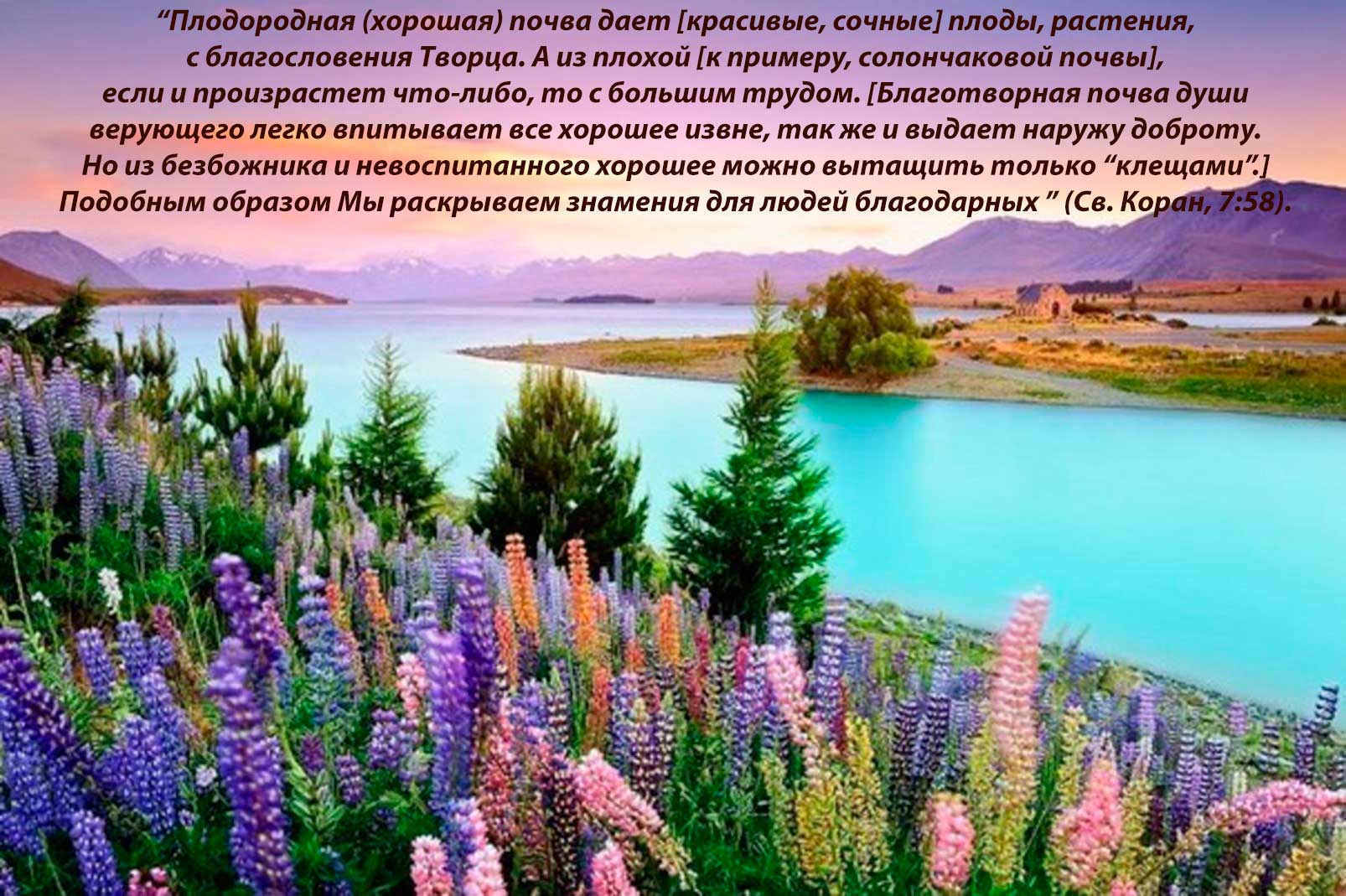 “Плодородная (хорошая) почва дает [красивые, сочные, вкусные и самые разные] плоды, растения, с благословения Творца. А из плохой [к примеру, солончаковой почвы], если и произрастет что-либо, то с большим трудом. [Соответственно, благотворная почва души верующего человека, как правило, легко и естественно впитывает все хорошее извне, так же и выдает наружу положительные эмоции, сдержанные реакции, добрые слова. Внешний облик наполнен благородством, даже если человек занят трудоемкой работой или очень скромно, бедно одет. Что касается безбожника и невоспитанного человека, то хорошее из него можно вытащить только “клещами”, он скуп на доброе слово, и ему сложно доброжелательно воспринимать окружающих.] Подобным образом Мы раскрываем знамения для людей благодарных [ведь лишь они по-настоящему смогут извлечь соответствующую пользу из такого рода примеров]” (Св. Коран, 7:58).