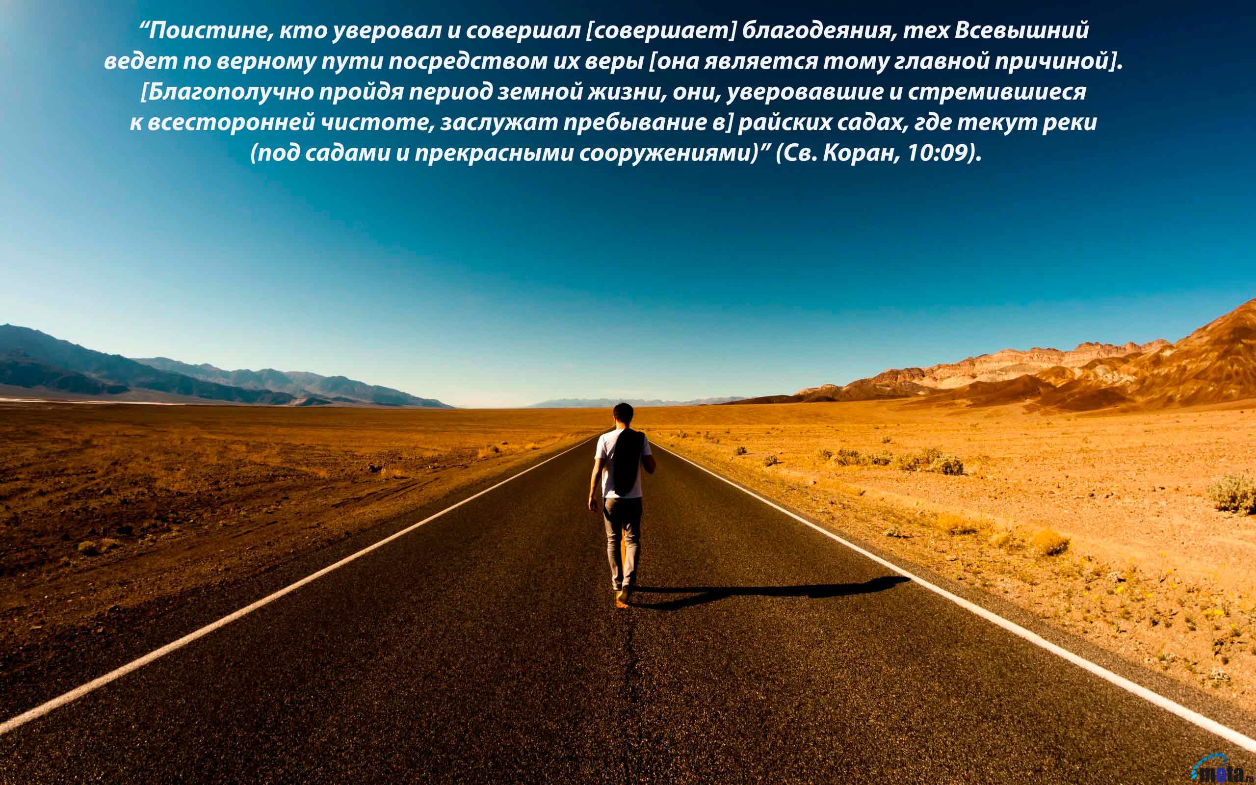 “Поистине, кто уверовал и совершал [совершает] благодеяния, тех Всевышний ведет по верному пути посредством их веры [она является тому главной причиной; Он дает им больше Божественных благословений и успешности в делах]. [Благополучно пройдя период земной жизни, где всегда стоит выбор между сатанинским и ангельским, между безвольным барахтаньем в пучине обстоятельств и самодисциплиной, они, уверовавшие и стремившиеся к всесторонней чистоте, заслужат пребывание в] райских садах, где текут реки (под садами и прекрасными сооружениями) [а виды настолько чудесны, что человеческому воображению не под силу это представить]” (Св. Коран, 10:09).