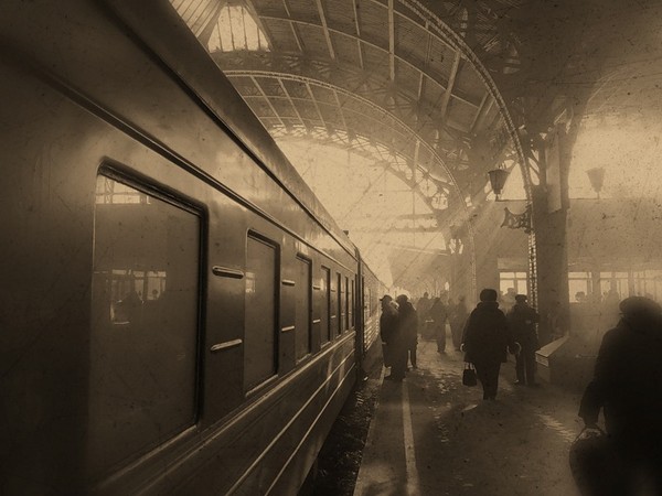 Столпились, ожидая поезд, люди.