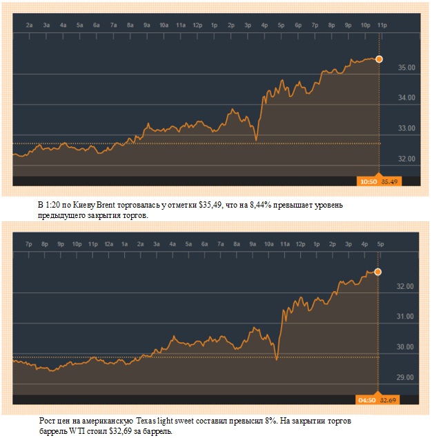 Рост цен на американскую Texas light sweet составил превысил 8%. На закрытии торгов баррель WTI стоил $32,69 за баррель.