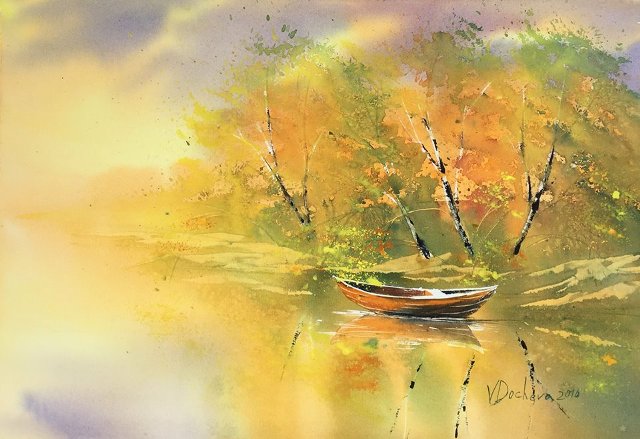 На думці осінь. Човен. Акварель.