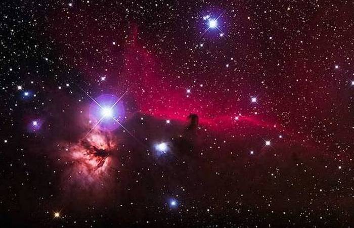 *1 - туманности в Поясе Ориона - Лошадиная Голова и Пламя (в форме раскрытых крыльев), ниже слева - туманность М42)