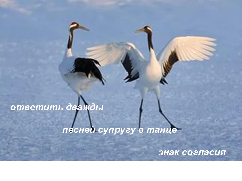 При этом самец всегда расправляет крылья, а самка держит их сложенными. Первым начинает кричать самец, самка на каждый возглас самца отвечает два раза. Ухаживание сопровождается характерными журавлиными танцами, которые могут включать в себя подпрыгивание, перебежки, хлопанье крыльями, подбрасывание пучков травы и наклоны.