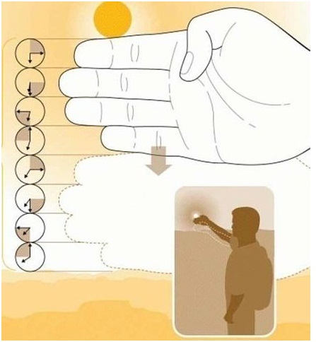 Итак, всё что необходимо сделать — вытянуть руку так, чтобы солнце как бы лежало на вашем указательном пальце. Теперь считаем количество пальцев до горизонта. Если у вас более-менее стандартная толщина пальцев, то каждый палец будет равен приблизительно 15 минутам до заката.