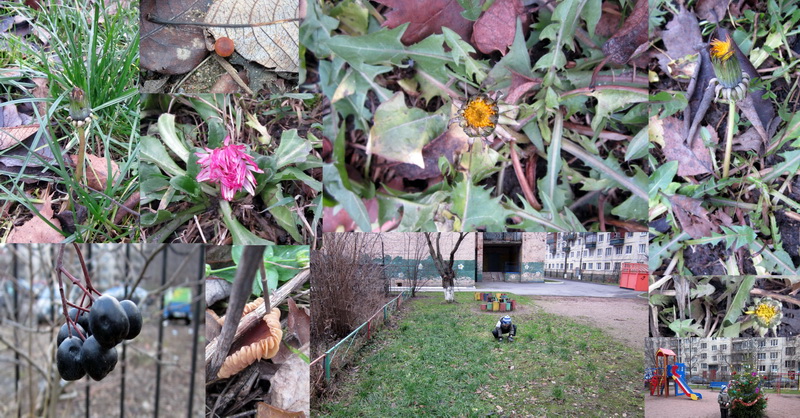На фото от 24 декабря: одуванчики, маргаритка, грибы-поганки, зелёная трава и черноплодная рябина.