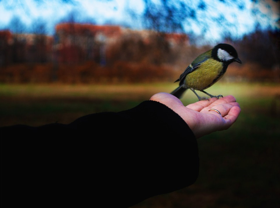 Синичка свободная сев на плечо