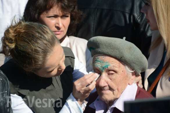 На фото ветеран ВОВ которую 9 мая 2016 в Славянске нацист облил зеленкой,а 10мая она умерла(моё мнение от сердечной боли и несправедливасти этих хамов ничего святого не имеют гады).