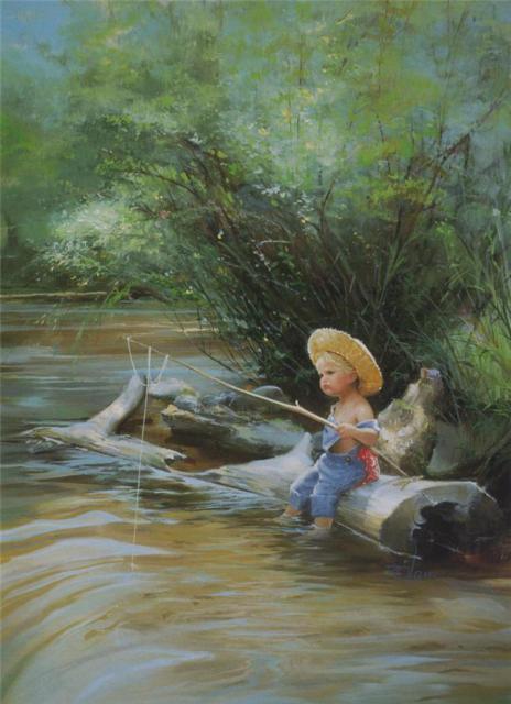 Стоит мой внук и ловит рыбу удочкой Отца,