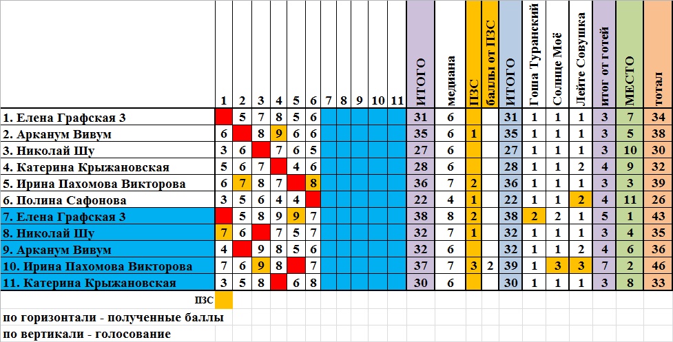 Прошу учитывать то, что система подсчёта по медиане НЕ ОЦЕНИВАЕТ стихи, а только определяет наиболее показательную оценку, полученную конкурсантом.