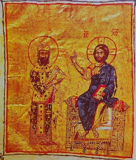 «Император Алексей I Комнин перед Христом (Миниатюра, XIII—XIV век, библиотека Афинского колледжа)