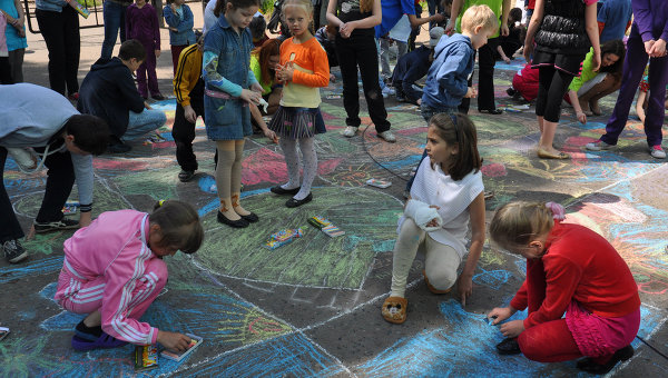 Дети крошили мел на асфальте