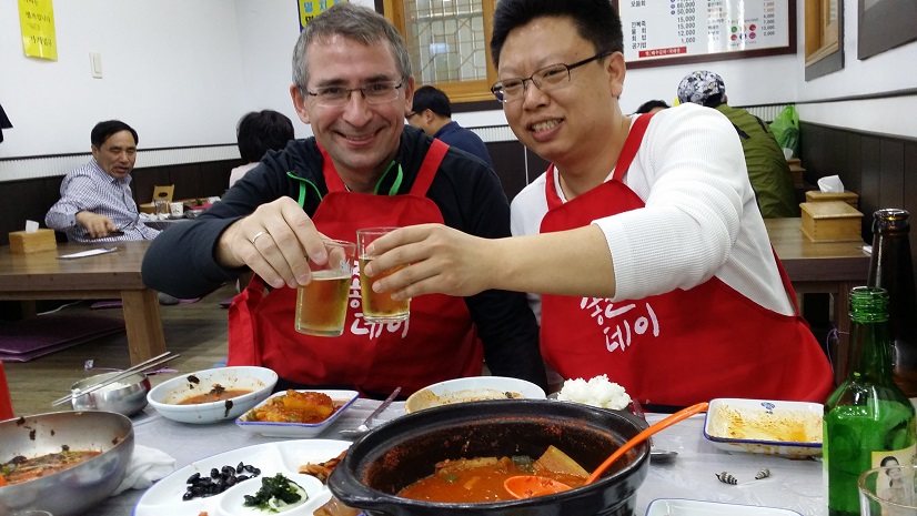 Во время поездки в Пусан (Busan) в приморской харчевне нас потчевали замечательным супчиком из рыбы сабли – «кальчи чорим» (тушенная в собственном соку). Примечательно, что в этом заведении были поданы не только скрученные мокрые полотенца для лица и рук, но и фартуки, чтобы не испачкать одежду! В фартуках в ресторане мы ещё никогда не ели, поэтому с удовольствием облачились в них и сфотографировались.
