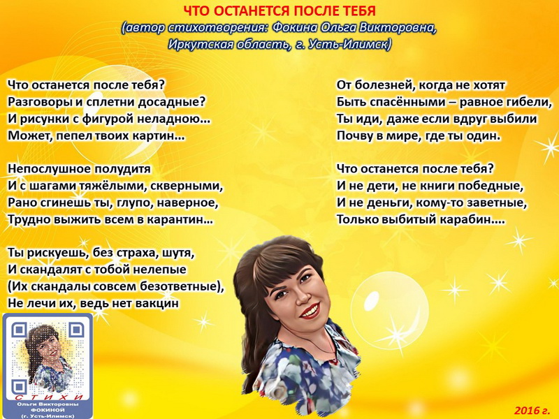 Стихотворение зарегистрировано на авторские права, поэтому его цитирование возможно только с указанием полного авторства: Фокина Ольга Викторовна (г. Усть-Илимск)