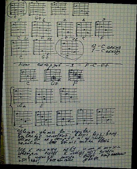 1. на 12 аккордах, хотя всего тут три аккорда, что повторяются: F_C_G7. Обратите внимание на то, в Каком порядке идут аккорды! Часто после Начального аккорда С мелодия переходит на аккорд F или G7, гитаристы это знают.