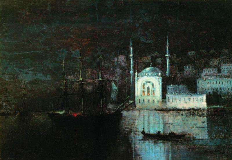 *Картина «Ночной Константинополь» тематически связана с циклом пейзажей Константинополя, к которым художник обращался в течение многих лет после своего путешествия в Турцию в 1845 г. с экспедицией Ф.П. Литке, и особенно в 1870-е гг., когда он был представлен турецкому султану Абдул-Азизу и написал по его заказу
