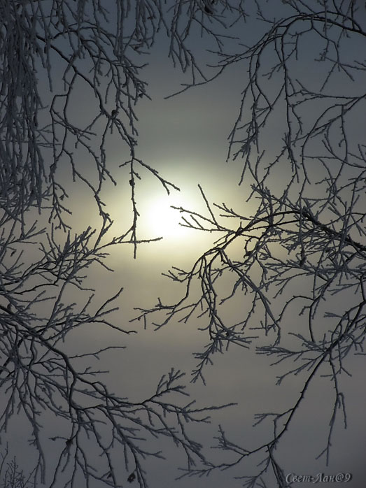 Сквозь узор изящный веток - шар озябшего Светила... СумерЕчный трепет цвета растушёван молчаливо... Густой воздух весь колючий... Ветер бодрый - заморожен... Хрустом снега мир озвучен,  первозданностью роскошен...
