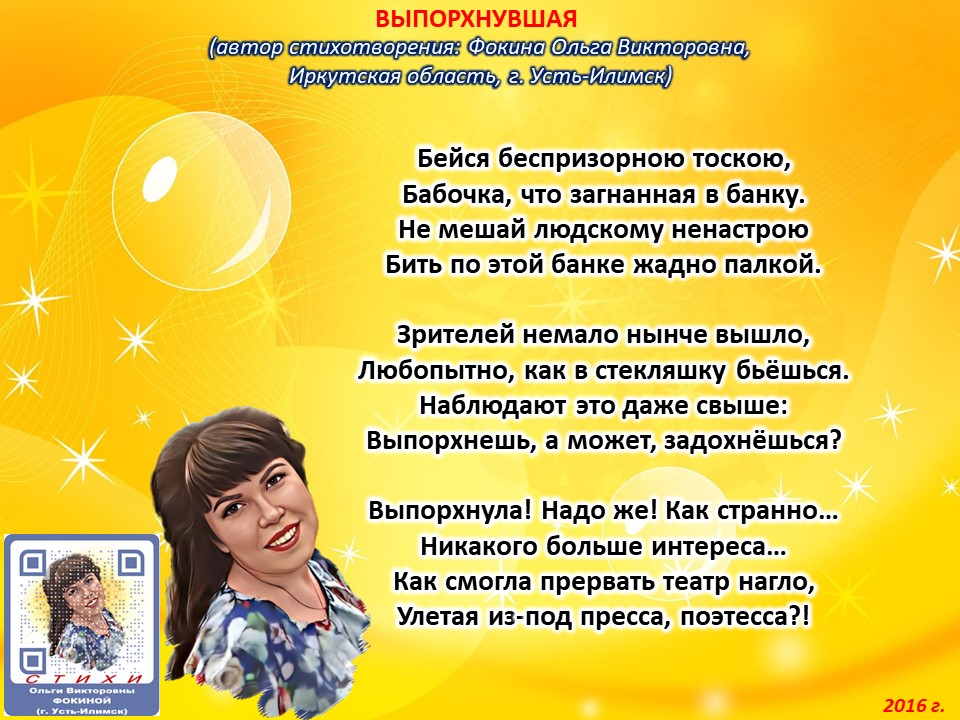 Стихотворение зарегистрировано на авторские права, поэтому его цитирование возможно только с указанием полного авторства: Фокина Ольга Викторовна (г. Усть-Илимск)