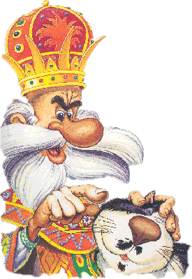 Сцена. Тронный зал. На троне со скучным видом сидит Царь и гладит Кота, который примостился у него на коленях. Рядом с троном стоит мешок жёлудей.По тронному залу бегает карликовый поросёнок Хфедюшка. Царь горстями бросает на мраморный пол жёлуди, а поросёнок с довольным хрюканьем их поедает.Весь пол засыпан жёлудями,Царь широко зевает, явно не выспался. В приёмной раздаются громкие голоса, слышен шум борьбы, распахиваются двери и в тронный зал вваливается Медведь с поднятыми в верх передними лапами, под левым глазом у него красуется фингал.Даже по внешнему виду видно что он с большого бодуна.Следом входит Егерь с ружьём наперевес.Через какое то время с шумом и грохотом следом протискиваются три бабы. Одна с коромыслом, другая с изрядно потрёпанной метлой, третья с двумя саблями на поясе и почему то с веслом.Стража пытается отнять у них ( оружие) но баба замахивается на них веслом те в страхе разбегаются.Царь поправляет корону,Кот увидев Медведя вздыбливает шерсть и с шипением взлетает на люстру.Кабанчик Хфедюшка прячется за трон.